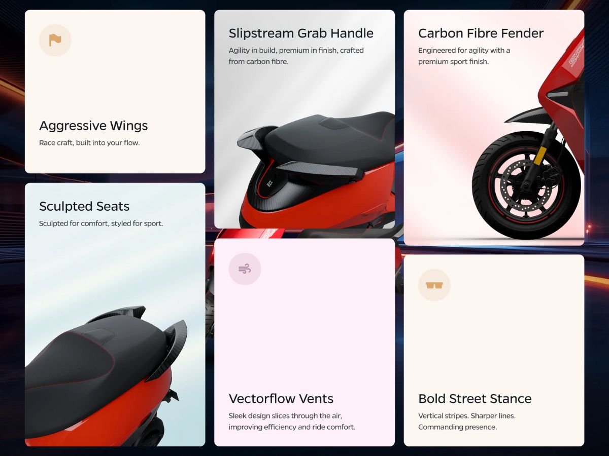 S1 Pro Sport हे स्पोर्ट्स स्कूटर सेगमेंटमध्ये ओलाने अधिकृत एंट्री केली आहे. ज्यामध्ये चांगली कामगिरी करणारे असे हार्डवेअर आणि नवीन टेक्नालॉजीचा वापर केला आहे. या स्कूटरची रचना विशेषतः नवीन आहे, ज्यामध्ये कार्बन फायबर फ्रंट मडगार्ड आणि ग्रॅब रेल, एरो विंग्स आणि एक स्कल्प्टेड विंडस्क्रीन दिली आहे. जी एरोडायनामिक्स आणि डाउनफोर्स सुधारते. स्कूप केलेले रायडर सीट आणि उंचावलेले पिलियन सेक्शन त्याला रेसर प्रोफाइल देते, तर कार्बन फायबर डिटेलिंग त्याची प्रीमियम पोझिशनिंग दर्शवते.