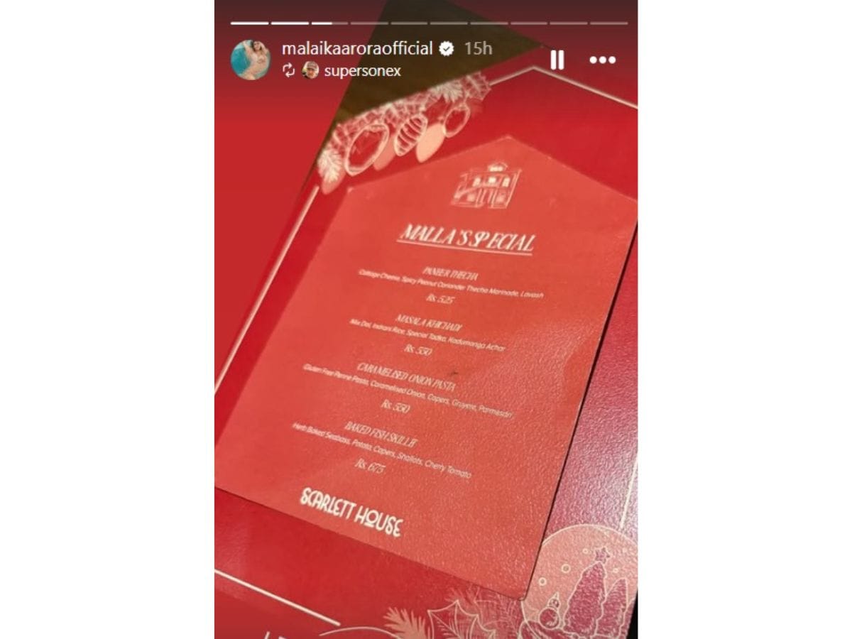 मलायकाने तिच्या इंस्टास्टोरीवर तिच्या खास 'स्कार्लेट हाऊस' रेस्टॉरंटचं मेन्यू कार्ड शेअर केलं. यामध्ये तिनं खास मेन्यू काय आहे याची एक झलक दाखवली. 'मल्लाज स्पेशल' सेक्शन तिने चाहत्यांना दाखवला. फोटोमध्ये पाहून शकता, मलायकाच्या रेस्टॉरंटमध्ये स्पेशल पनीर ठेसा मिळतो. या पदार्थाची किंमत आहे 525. त्यानंतर मसाला खिचडी आहे, त्याची किंमत 550 आहे. याशिवाय खास मेन्यूमध्ये कॅरेमल्ज ओनियन पास्ताही आहे. याची किंमत 550 आहे.