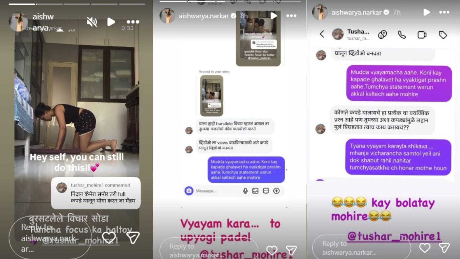 या व्हिडिओवर एका युझरने कमेंट करत लिहिलं, "निदान कॅमेरासमोर तरी फुल कपडे घालून योगा करत जा मॅडम." या कमेंटकडे दुर्लक्ष न करता ऐश्वर्या नारकर यांनी त्याला थेट दिलं. त्या कमेंटचा स्क्रीनशॉट शेअर करत लिहिलं, "बुरसटलेले विचार सोडा. तुमचा फोकस का हलतोय?" मात्र त्यानंतरही तो युझर थांबला नाही. त्याने पुन्हा मेसेज करत म्हटलं, "याला तुम्ही बुरसटलेले विचार म्हणत असाल तर तुमच्या अकलेची कीव करावीशी वाटते. व्हिडिओला व्ह्यूज वाढवण्यासाठी असे कपडे घालून व्हिडिओ बनवता."