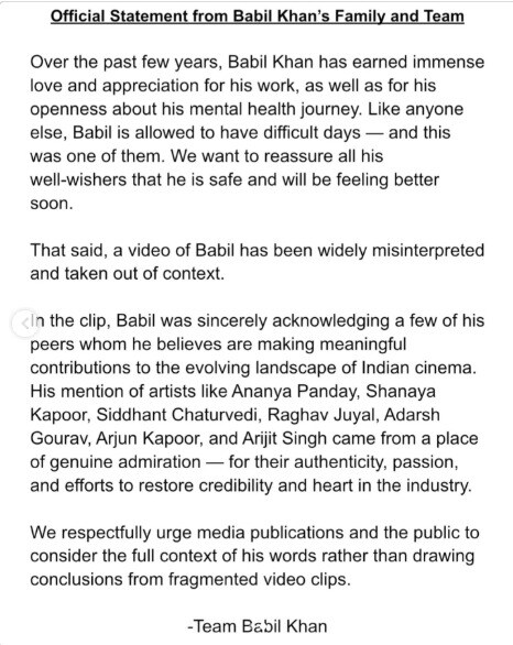 पण आता बाबिलच्या कुटुंबाने आणि मॅनेजमेंट टीमने यावर अधिकृत स्पष्टीकरण दिलं आहे. हिंदुस्तान टाइम्सच्या रिपोर्टनुसार, बाबिलच्या कुटुंबाने एक निवेदन जारी करत सांगितलं की, “बाबिल पूर्णपणे सुरक्षित आहे आणि सध्या केवळ एक कठीण टप्पा अनुभवतो आहे. तो देखील आपल्यासारखाच एक तरुण आहे, ज्याला कधी कधी मानसिक आरोग्याची लढाई लढावी लागते.”