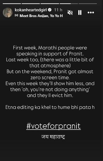 अंकिता वालावलकरने याआधीही प्रणितसाठी पोस्ट शेअर केली होती. त्यावेळी कोकण हार्टेड गर्ल म्हणाली होती,"हीच ती वेळ आहे. अख्ख्या महाराष्ट्राने वोट करा. सगळ्या मराठी लोकांनी, गावातल्या गाववाल्यांनी...आता तर आम्हाला बघायचंच आहे की, गावी कोण परत जातंय ते...प्रणितला आतचं ठेवायचं, तो बाहेर येताच कामा नये...'बिग बॉस'च्या घरात आतमध्ये गेल्यावर काय होतं हे माझ्यापेक्षा जास्त कोणाला माहिती असेल? प्रणितची अवस्था तशीच झाली आहे. उगीच जाऊन किडे करा, मुद्दे बनवा आणि त्यावर भांडण करा, असे आपण नाही आहोत. आपल्या भावाला पाठिंबा द्या..भरपूर वोट्स करा". बसीर प्रणितला गावी जा, असं म्हणाला होता त्यानंतर अंकिताने ही पोस्ट शेअर केली होती. तसेच प्रणितने बसीरला चड्डीत राहा, अख्खं महाराष्ट्र माझं गाव आहे, असं उत्तर दिलं होतं.
