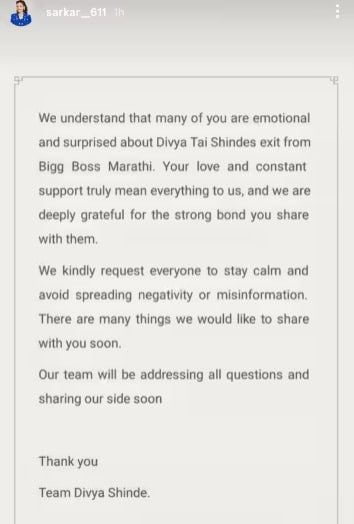 पोस्टमध्ये म्हटलं आहे, "आम्ही समजू शकतो की, 'बिग बॉस मराठी' शोमधून दिव्या शिंदेची एक्झिट झाल्यामुळे अनेक लोक भावुक झालेत तर काहींना धक्का बसला आहे. पण तुमचं प्रेम आणि पाठिंबा आमच्यासाठी सर्वकाही आहे. आम्ही तुम्हा सर्वांचे मनापासून आभार मानतो. पण सर्वांना एक विनंती करतो, कृपया कोणीही या घटनेबाबत चुकीची माहिती किंवा नकारात्मकता पसरवू नका. आम्हाला तुम्हाला खूप काही सांगायचं आहे. आम्ही लवकरच तुमच्या सगळ्या प्रश्नांची उत्तरं देऊ आणि आमची बाजूही मांडू"