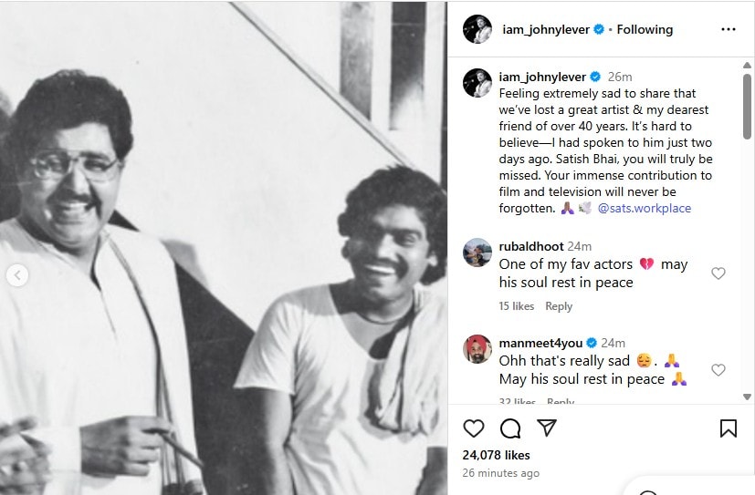 साराभाई वर्सेस साराभाई या लोकप्रिय मालिकेत त्यांनी साकारलेली इंद्रवदन साराभाई उर्फ इंदु या भुमिकेनं प्रेक्षकांचं मनोरंजन केलं. सतीश शाह यांच्या निधनाची बातमीनं बॉलिवूडवर शोककळा पसरली आहे. त्यांच्या निधनाची बातमी कळताच अनेक कलाकारांनी शोक व्यक्त केला आहे. अभिनेते जॉनी लिव्हर यांनी पोस्ट शेअर करत दु:ख व्यक्त केलं. त्यांनी लिहिलंय, "अत्यंत दुःखानं सांगावं लागत आहे की, आपण एक महान कलाकार आणि माझा 40 वर्षांपासूनचा जिवलग मित्र गमावला आहे. विश्वास बसत नाहीये. कारण दोन दिवसांपूर्वीच मी त्याच्याशी बोललो होतो. सतीश भैय्या, तुमची खूप आठवण येईल. चित्रपट आणि दूरदर्शन क्षेत्रातील तुमचं अमूल्य योगदान कधीही विसरलं जाणार नाही."