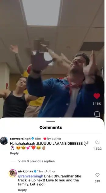 निक जोनसचा हा डान्स पाहून आपला 'धुरंधर' अभिनेता रणवीर सिंग गप्प बसणं शक्यच नव्हतं. रणवीरने या व्हिडिओवर कमेंट करत लिहिलं, "Hahahahahaa JIJUUUU JAAANE DEEEEE." रणवीरने निकला प्रेमाने 'जीजू' म्हटल्याने भारतीय चाहत्यांमध्ये एकच हशा पिकला.