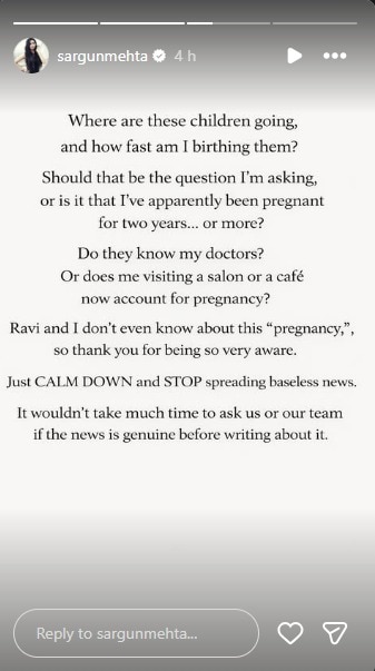 बातम्यांच्या विश्वासार्हतेवर प्रश्नचिन्ह उपस्थित करत सरगुन पुढे लिहिते, "एखादी बातमी छापण्यापूर्वी किमान आम्हाला किंवा आमच्या टीमला विचारणं इतकं अवघड आहे का? आता काय सॅलूनमध्ये जाणं किंवा कॅफेमध्ये कॉफी प्यायला जाणं म्हणजे प्रेग्नन्सी मानली जाते का? या अफवांमधील मुलं कुठे जात आहेत आणि मी त्यांना इतक्या लवकर जन्म कशी देतेय, हे मलाच समजत नाहीये." तिने स्पष्ट केलं की, स्वतः रवी आणि तिलाच या काल्पनिक प्रेग्नन्सीबद्दल काहीही माहिती नाही.