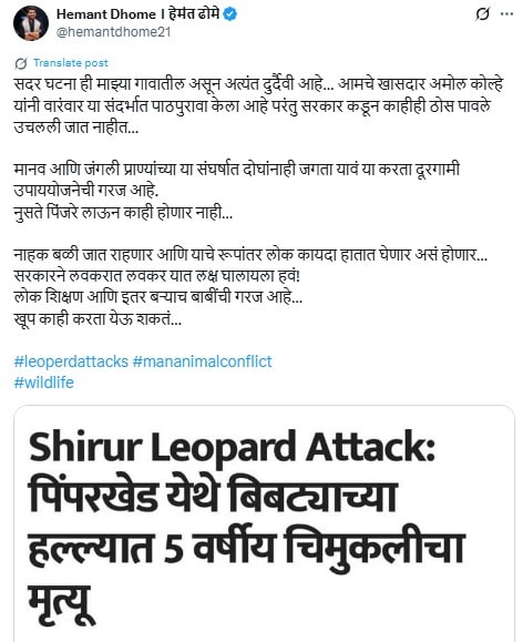 हेमंतने पुढे लिहिलंय, "मानव आणि जंगली प्राण्यांच्या या संघर्षात दोघांनाही जगता यावं या करता दूरगामी उपाययोजनेची गरज आहे. नुसते पिंजरे लाऊन काही होणार नाही. नाहक बळी जात राहणार आणि याचे रूपांतर लोक कायदा हातात घेणार असं होणार"