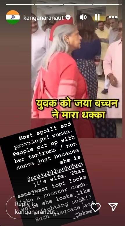 कंगना राणौतने तिच्या इन्स्टा स्टोरीवरून या घटनेवर आपलं मत व्यक्त केलं. ती म्हणाली, "जया बच्चन यांना लोक फक्त यासाठी सहन करतात, कारण त्या अमिताभ बच्चन यांच्या पत्नी आहेत. त्यांचं हे वागणं पूर्णपणे चुकीचं आहे."