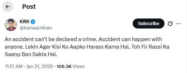 जामिनावर सुटल्यानंतर KRK यांनी सोशल मीडियावर लिहिलं, "अपघाताला गुन्हा ठरवता येत नाही. अपघात कोणाच्याही बाबतीत होऊ शकतो. पण जर कुणाला तुम्हाला त्रास द्यायचाच असेल, तर दोरीचाही साप बनू शकतो."