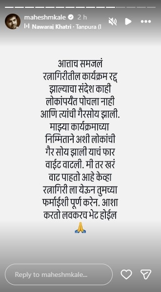 दरम्यान महेश काळेनं स्वत: पोस्ट शेअर करत दिलगिरी व्यक्त केली. महेशनं पोस्टमध्ये लिहिलं, "आत्ताच समजलं रत्नागिरीतील कार्यक्रम रद्द झाल्याचा संदेश काही लोकांपर्यंत पोचला नाही आणि त्यांची गैरसोय झाली."