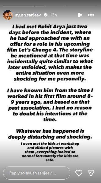 रुचितानंतर आता आणखी एका मराठी अभिनेत्यानं पोस्ट लिहित रोहित आर्यबद्दल धक्कादायक माहिती दिली आहे. मराठी मालिका सिनेमांत काम करणारा प्रसिद्ध मराठी अभिनेता आयुष संजीव याने सोशल मिडिया पोस्टमध्ये लिहिलंय, "घटनेच्या केवळ दोन दिवस आधी माझी रोहित आर्यशी भेट झाली होती. त्याने मला त्याच्या आगामी 'लेट्स चेंज 4' या चित्रपटात एका भूमिकेची ऑफर दिली होती. त्यावेळी त्याने सांगितलेली कथा आणि नंतर जे काही घडले त्या घटनेशी मिळती जुळती होती. ही संपूर्ण घटना माझ्यासाठी वैयक्तिकरित्या खूप धक्कादायक आहे."