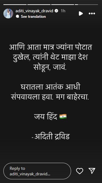 अदिती द्रविड ही नेहमीच आपल्या स्पष्टवक्तेपणासाठी ओळखली जाते. तिची ही पोस्ट 'ऑपरेशन सिंदूर'ला पाठिंबा देणारी आहे. पाकिस्तानवर हल्ला कधी होणार? होणार की नाही, असे प्रश्न गेल्या 15 दिवसांत विचारून भारतीय सैन्यावर आणि सरकारवर ज्यांनी ज्यांनी अविश्वास दाखवला, त्यांच्या आता पोटात दुखत असेल तर त्यांनी देश सोडून जायला हवे, असे थेटपणे सांगत 'घरातला आतंक' आधी संपवायला हवा आणि नंतर बाहेरचा, अशी टिप्पणी आदितीने केली आहे. अदितीची पोस्ट व्हायरल होत असून चर्चेचा विषय ठरली आहे.