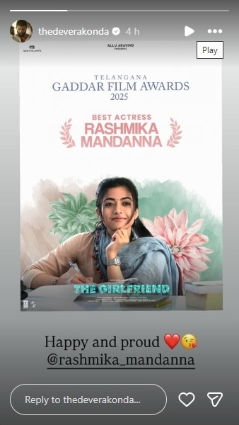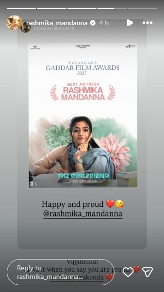 विजयने आपल्या इन्स्टाग्राम स्टोरीवर रश्मिकाच्या चित्रपटाचं पोस्टर शेअर करत फक्त दोन शब्द लिहिले, पण त्यात बरंच काही होतं. विजयने त्याच्या इन्स्टाग्राम स्टोरीवर "Happy and Proud" असं म्हणत त्याने रश्मिकाचं कौतुक केलंय. राहुल रवींद्रन दिग्दर्शित 'द गर्लफ्रेंड' या चित्रपटाने केवळ बॉक्स ऑफिसवरच नाही, तर प्रेक्षकांच्या मनावरही राज्य केलं. एका टॉक्सिक रिलेशनशिपमध्ये अडकलेल्या 'भूमा देवी' नावाच्या मुलीची भूमिका रश्मिकाने इतकी जिवंत केली की, समीक्षकांनीही तिचं तोंडभरून कौतुक केलं.