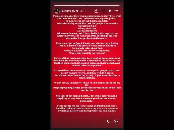 "माझ्याबद्दल ज्या अफवा पसरवल्या जात आहेत, त्या पूर्णपणे चुकीच्या आहेत आणि त्यांच्यावर विश्वास ठेवण्यापूर्वी लोकांनी सत्य जाणून घ्यावे," असे तिने स्पष्ट केले. ऐश्वर्याने सांगितले की, "माझी जेव्हापासून एंगेजमेंट झाली आहे, तेव्हापासून मला सातत्याने ट्रोल केले जात आहे आणि मी ते नेहमी हसून-हसून सहन केले आहे." तिने स्पष्ट केले की, तिने कधीही कोणाला त्रास दिला नाही किंवा वाईट वागणूक दिली नाही, उलट ती स्वतःच 'बुली'चा बळी ठरली आहे, जे सामान्य लोकांच्या नजरेत येत नाही.