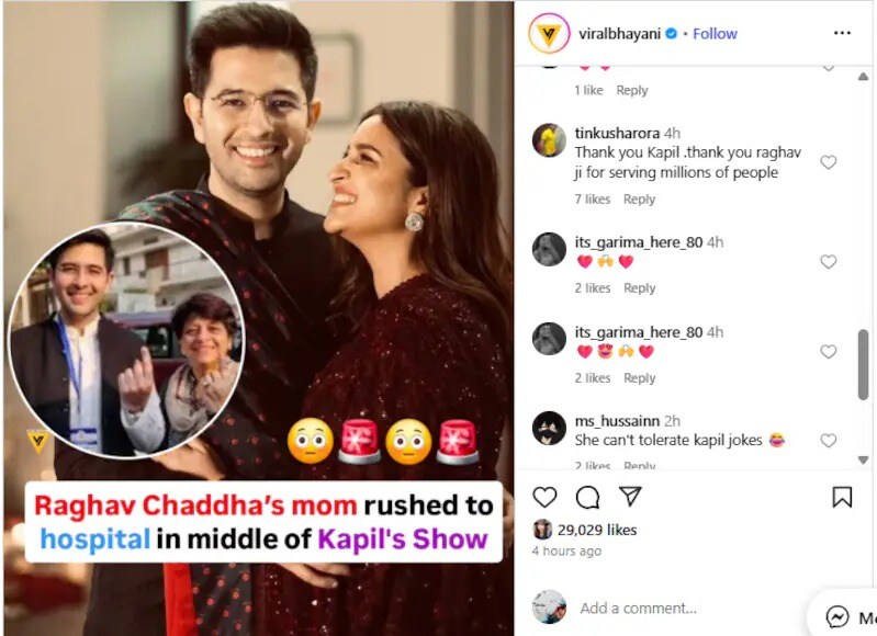 विरल भयानी यांच्या पोस्टवर चाहत्यांनी चिंता व्यक्त केली आहे. अनेक जण परिस्थिती ठीक होण्याची आणि परिणीतीच्या सासूबाई लवकरात लवकर बऱ्या होण्याची आशा व्यक्त करत आहेत. काही चाहत्यांनी तर, सध्या तरी परिणीती चोप्रा आणि राघव चढ्ढा यांना शोमध्ये पाहता येणार नाही, याबद्दल नाराजीही व्यक्त केली.