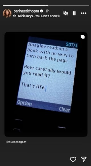 या घटनेनंतर, परिणीती चोप्राने आपल्या इन्स्टाग्राम स्टोरीवर आयुष्याबद्दल एक क्रिप्टिक पोस्ट शेअर केली आहे, ज्याचा अर्थ लावण्याचा प्रयत्न तिचे चाहते करत आहेत. परिणीतीने तिच्या पोस्टमध्ये लिहिलं आहे, "कल्पना करा, तुम्ही एक पुस्तक वाचत आहात. त्यात मागचं पान पलटण्याचा पर्याय नाही. मग तुम्ही किती काळजीपूर्वक ते पुस्तक वाचाल? हेच तर जीवन आहे."