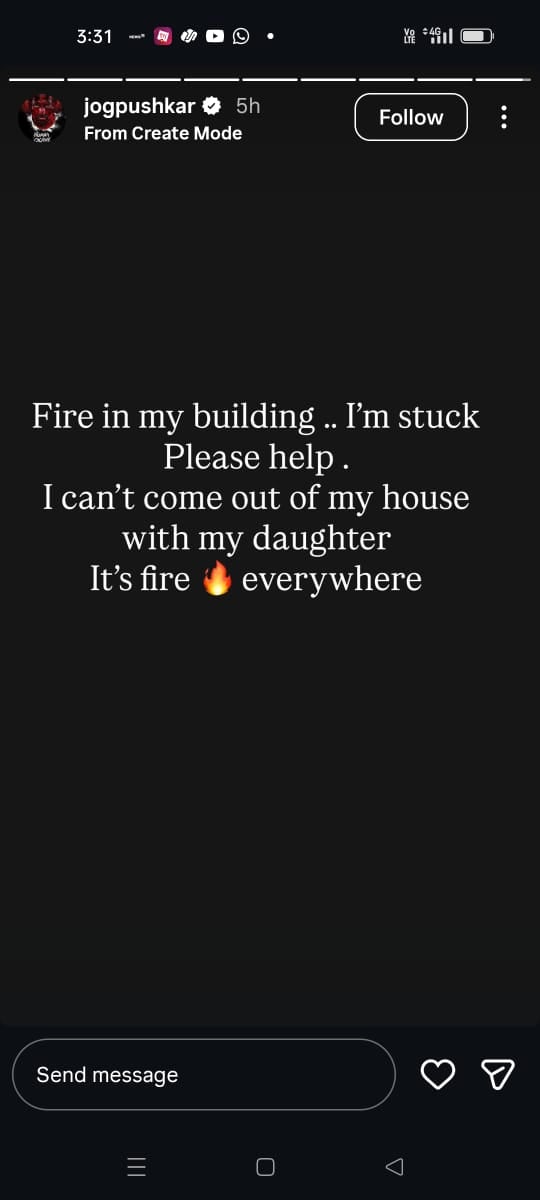 पुष्करने त्याच्या इन्स्टाग्राम स्टोरीवर पोस्ट लिहिली होती. त्यात त्याने म्हटलं होतं, "माझ्या इमारतीला आग लागली आहे. मी त्यात अडकलो आहे. माझी मदत करा. मी घरातून बाहेर पडू शकत नाहीये. माझ्यासोबत माझी मुलगी आहे. सर्वत्र आग लागली आहे."