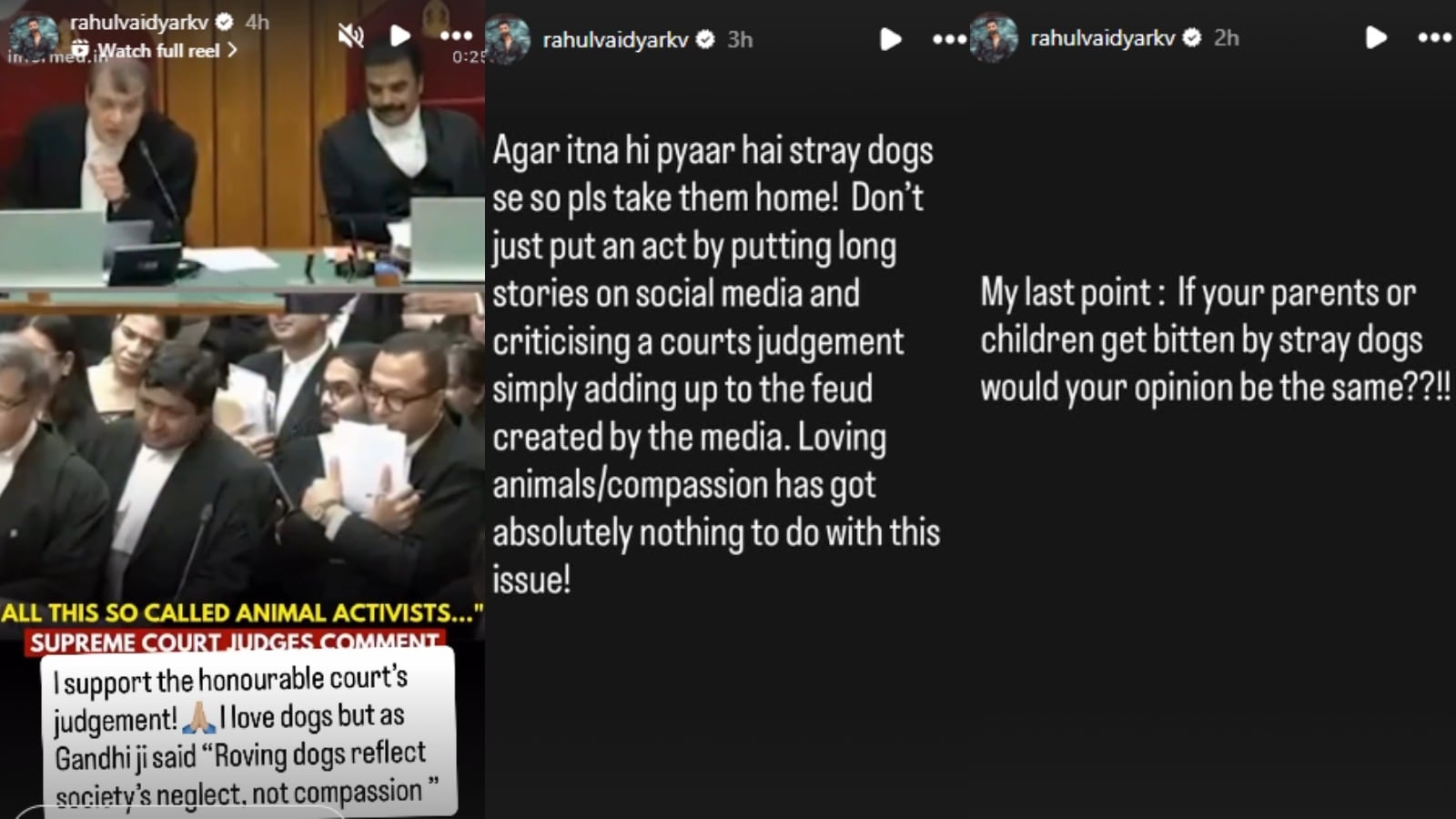 राहुल वैद्यने त्याच्या इन्स्टाग्राम स्टोरीवर न्यायालयाच्या निर्णयाचं समर्थन करताना म्हटलं आहे की, 'मी माननीय न्यायालयाच्या निर्णयाचं समर्थन करतो. मला कुत्रा हा प्राणी खूप आवडतो, पण गांधीजींनी म्हटल्याप्रमाणे, फिरणारे कुत्रे समाजाची निष्काळजीपणा दर्शवतात, करुणा नाही.'