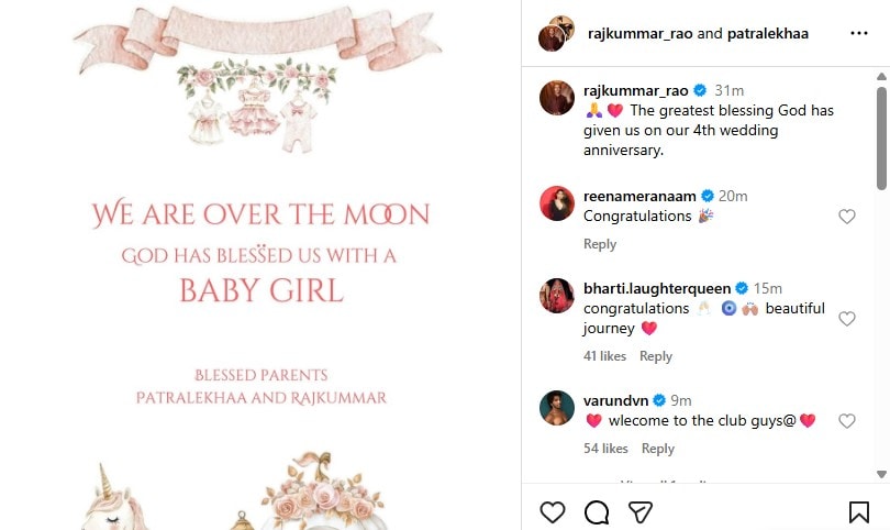 अभिनेता राजकुमार राव आणि पत्रलेखा यांना लग्नाच्या चार वर्षांनी मुलगी झाली आहे. "आम्ही खूप आनंदी आहोत. देवाने आम्हाला एका गोंडस मुलीचे वरदान दिलं आहे", असं म्हणत राजकुमार राव आणि पत्रलेखा यांनी पोस्ट शेअर केली आहे. राजकुमार रावने पोस्टच्या कॅप्शनमध्ये लिहिलंय, "आमच्या चौथ्या लग्नाच्या वाढदिवसानिमित्त देवाने आम्हाला दिलेला हा सर्वात मोठा आशीर्वाद आहे."