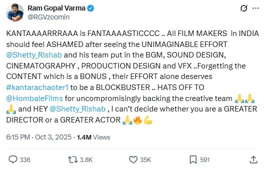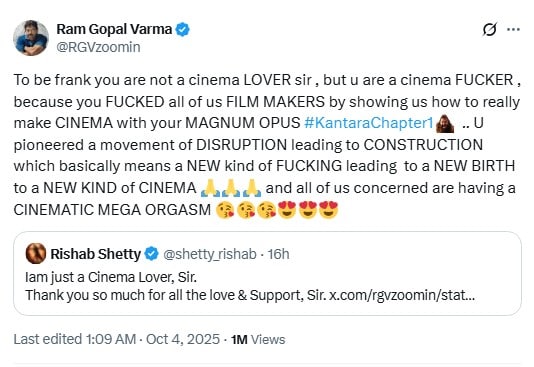 राम गोपाल वर्मा यांनी ऋषभ शेट्टीचं हेच ट्विट पुन्हा शेअर करत लिहिलंय, "तू सिनेमा Lover नाही, तू सिनेमा FUCKER आहेस. तू आम्हा सर्व फिल्ममेकर्सना दाखवून दिलं की खरं सिनेमा कसा बनवायचा. तुझ्या ‘Kantara Chapter 1’ या महाकाव्यानं भारतीय सिनेमात एक नवा अध्याय सुरू केला आहे. तू निर्माण आणि नवकल्पना यांचा नवा प्रवाह सुरू केलास, ज्यामुळे नव्या प्रकारच्या सिनेमाचा जन्म झाला आहे. आम्हा सर्वांना या अनुभवामुळे सिनेमाविषयी प्रचंड उत्साह आणि प्रेरणा मिळाली आहे."
