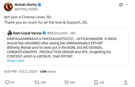 राम गोपाल वर्मा यांचं हे ट्विट शेअर करत ऋषभ शेट्टीने त्यांचे आभार मानले. तो म्हणाला, "मी फक्त सिनेमावर प्रेम करणारा एक माणूस आहे सर. तुमच्या प्रेम आणि पाठिंब्याबद्दल मनापासून आभार."