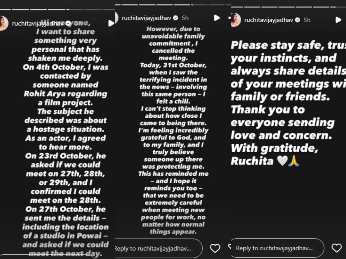 रूचिताने तिच्या पोस्टमध्ये लिहिलंय, "आज 31 ऑक्टोबरला, जेव्हा मी या व्यक्तीशी संबंधित भीषण घटनेची बातमी पाहिली तेव्हा मला भीती वाटली.  मी किती जवळ पोहोचले होते. मी देवाचे, माझ्या कुटुंबाचे अत्यंत आभारी आहे. मला खरंच वाटतं की वर कुणीतरी माझं संरक्षण करत होतं. या घटनेने मला लक्षात आलं आणि मला आशा आहे की तुमच्याही हे लक्षात येईल.  नवीन लोकांशी कामासाठी भेटताना अत्यंत सावध राहणं आवश्यक आहे, जरी सर्व काही सामान्य वाटत असेल तरी. कृपया सुरक्षित राहा, तुमच्या अंतर्ज्ञानावर विश्वास ठेवा, आणि नेहमी तुमच्या भेटींची माहिती कुटुंब किंवा मित्रांशी शेअर करा प्रेम आणि काळजी व्यक्त करणाऱ्या सर्व लोकांचे धन्यवाद."