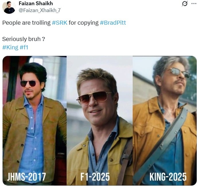 'किंग'चा पहिला लूक प्रदर्शित होताच, सोशल मीडियावर मोठी चर्चा रंगली. शाहरुखचा निळ्या शर्ट आणि टॅन जॅकेटमधील हा लूक आणि ब्रॅड पिटच्या 'F1' चित्रपटातील एका सीनचा लूक हे जवळपास सारखे दिसत असल्याचा दावा अनेकांनी केला. अनेकांनी X वर या दोन लूकचे व्हिडिओ आणि फोटो शेअर केले. काही युजर्सनी याला इन्स्पिरेशन म्हटले, तर काहींनी थेट चीप कॉपी असे टोमणे मारले.