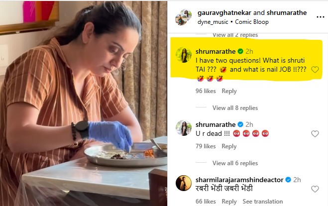 "नेल्स अपॉइंटमेंटनंतर तुमची नखं वाचवणं..." असं कॅप्शन देत गौरवने श्रृतीचा व्हिडीओ शेअर केला आहे. या व्हिडीओवर श्रृती कमेंट करत गौरवलाच प्रश्न विचारला आहे. तिने लिहिलंय, "मला दोन प्रश्न विचारायचे आहेत, एक म्हणते ताई काय आहे? दुसरा नेल जॉब काय आहे?" त्यानंतर श्रृतीने आणखी एक कमेंट करत "तू मेलास" असं लिहित अँग्री इमोजी देखील पोस्ट केलेत.