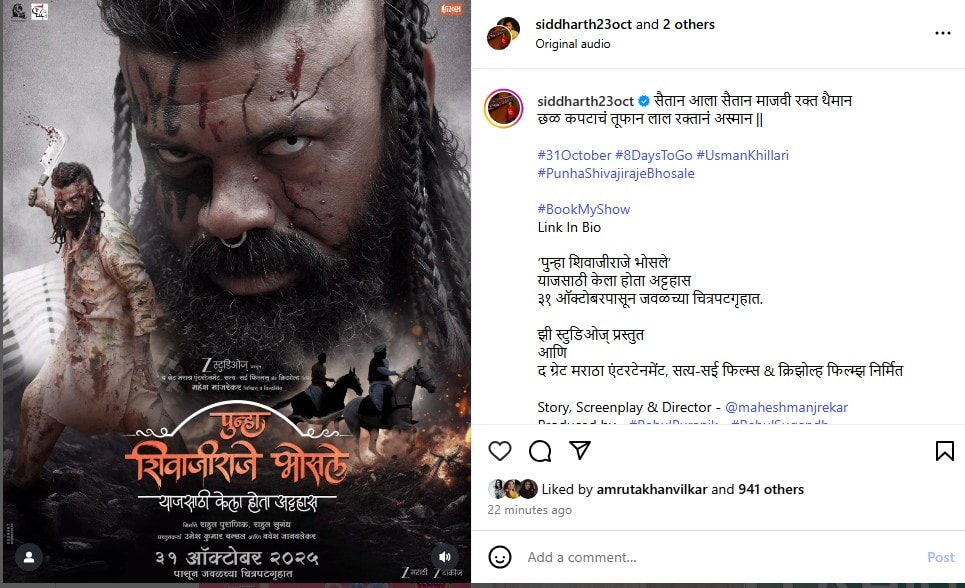 ऑक्टोबर महिन्यात येणाऱ्या बहुप्रतिक्षित सिनेमांपैकी एक सिनेमा म्हणजे 'पुन्हा शिवाजीराजे भोसले'. सिनेमाचा ट्रेलर काही दिवसांआधी रिलीज झालाय ज्याला प्रेक्षकांचा उत्तम प्रतिसाद मिळतोय. दरम्यान त्याआधी एक गाणं रिलीज झालं होतं ज्यात दिग्दर्शक, अभिनेते आणि निर्माते महेश मांजरेकर यांचा खतरनाक लुक समोर आला होता. त्या लुकमध्ये महेश मांजरेकर यांना ओळखणंही कठीण झालं होतं.