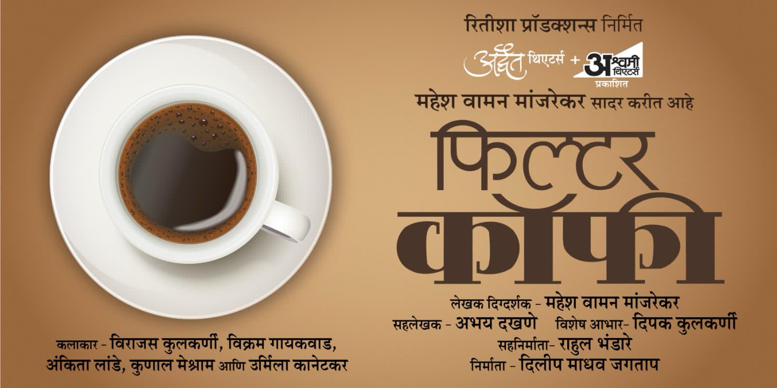 कॉफीची चाहूल वेगळीच! मग ती थंड असो वा गरम. कॉफीचे चाहते कमी नाहीत. घरात कॉफीचा सुगंध दरवळतो तसाच आता रंगभूमीवरही दरवळणार आहे. ज्येष्ठ दिग्दर्शक महेश वामन मांजरेकर हे 'फिल्टर कॉफी' हे नाटक घेऊन येत आहेत. अद्वैत आणि अश्वमी थिएटर्स प्रकाशित आणि महेश वामन मांजरेकर सादर करत असलेली ही 'फिल्टर कॉफी' 6 एप्रिलला रंगभूमीवर येणार आहे. या नाटकात उर्मिला कोठारे प्रमुख भूमिकेत आहे.