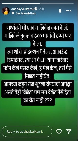 आशयने शेअर केलेल्या पोस्टमध्ये म्हटलं, मध्यंतरी मी एका मालिकेत काम केलं. मालिकेने नुकताच 800 भागांचा टप्पा पार केला. त्या शो चे प्रोडक्शन मॅनेजर, अकाऊंट डिपार्टमेंट, त्या शो चे EP यांना वारंवार फोन केले, मेसेज केले. तरीही पैसे मिळत नाहीये. आमच्याकडून रोज शूटला येण्याची अपेक्षा असते. तेही 'वेळेत' पण मग वेळेत पैसे देता का येत नाही??? असा संतप्त प्रश्नही आशयने विचारला. आशयने त्याच्या इन्स्टाग्रामवर ही पोस्ट शेअर करताच त्याचे स्क्रीनशॉट सोशल मीडियावर व्हायरल होत आहेत.
