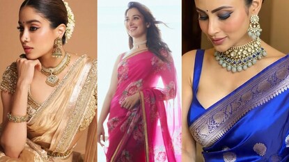 निळी साडी : निळ्या साडीवर तुम्ही सिल्व्हर किंवा डायमंड ज्वेलरी घालू शकता. तसेच या साडीसोबत व्हाईट स्टोन ज्वेलरीदेखील खूप छान दिसते. याने तुम्हाला एकदम मॉडर्न आणि एलिगंट लूक मिळेल.