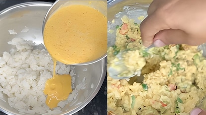 आता बेसनचं मिश्रण भिजवलेल्या पोह्यांमध्ये घालून चांगले मिक्स करून घ्या. सोबतच पोहे थोडे मॅशही करा. आता यात बारीक चिरलेला कांदा, हिरवी मिरची, टोमॅटो, बारीक चिरलेली शिमला मिरची, बारीक चिरलेली कोथिंबीर घालून चांगलं मिक्स करून घ्यायचं.