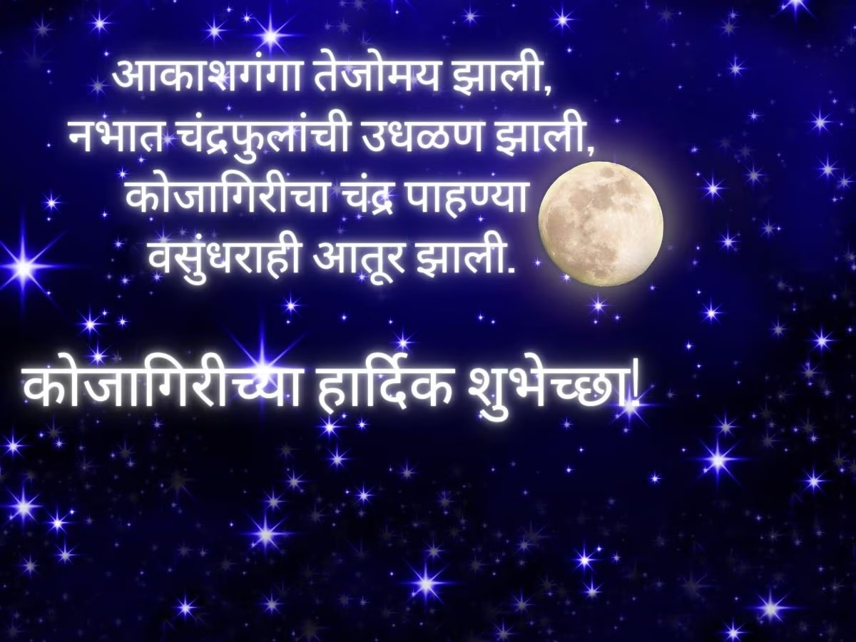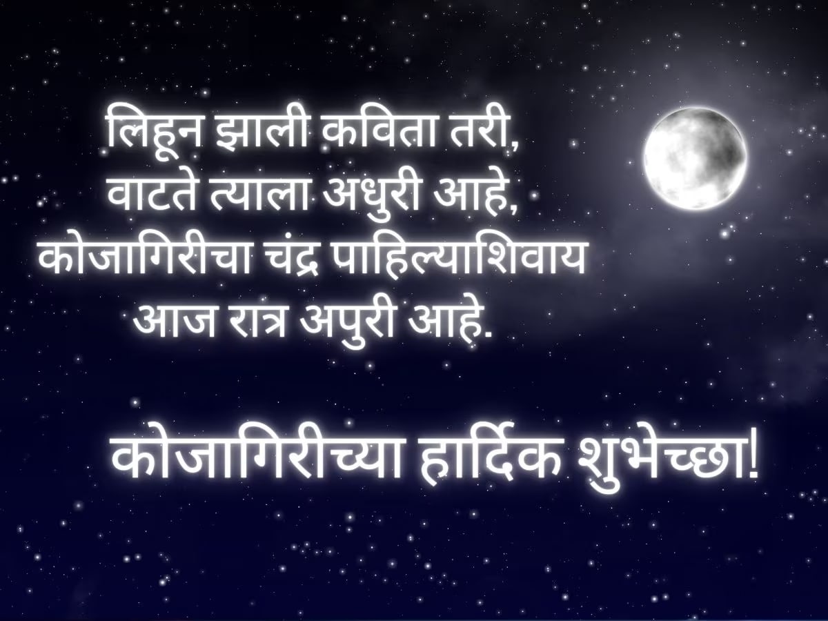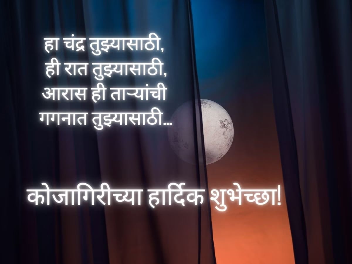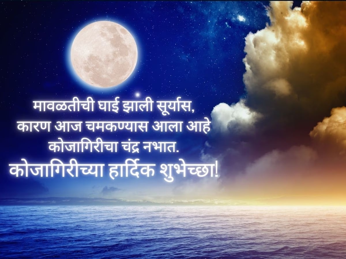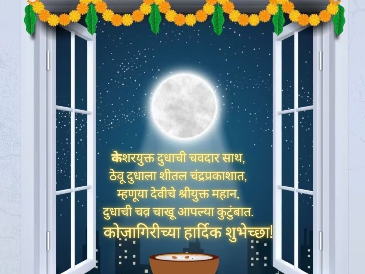 नवरात्रीचे 9 दिवस तुम्ही रंगाचं महत्त्व सांगणारे, देवीची विविध रुपं, असे फोटो तुम्ही व्हॉट्सअॅप स्टेसस, डीपाला किंवा इतर सोशल मीडियावर ठेवले असाल. आता कोजागिरीसाठीही असेच शुभेच्छांच्या मेसेज, स्टेटस आणि फोटो तुमच्यासाठी. 2025 सालातील कोजागिरी 6 ऑक्टोबर, सोमवारी आहे. त्याआधी हे शुभेच्छा मेसेज, डीपीसाठी फोटो, स्टेटस सेव्ह करून ठेवा.