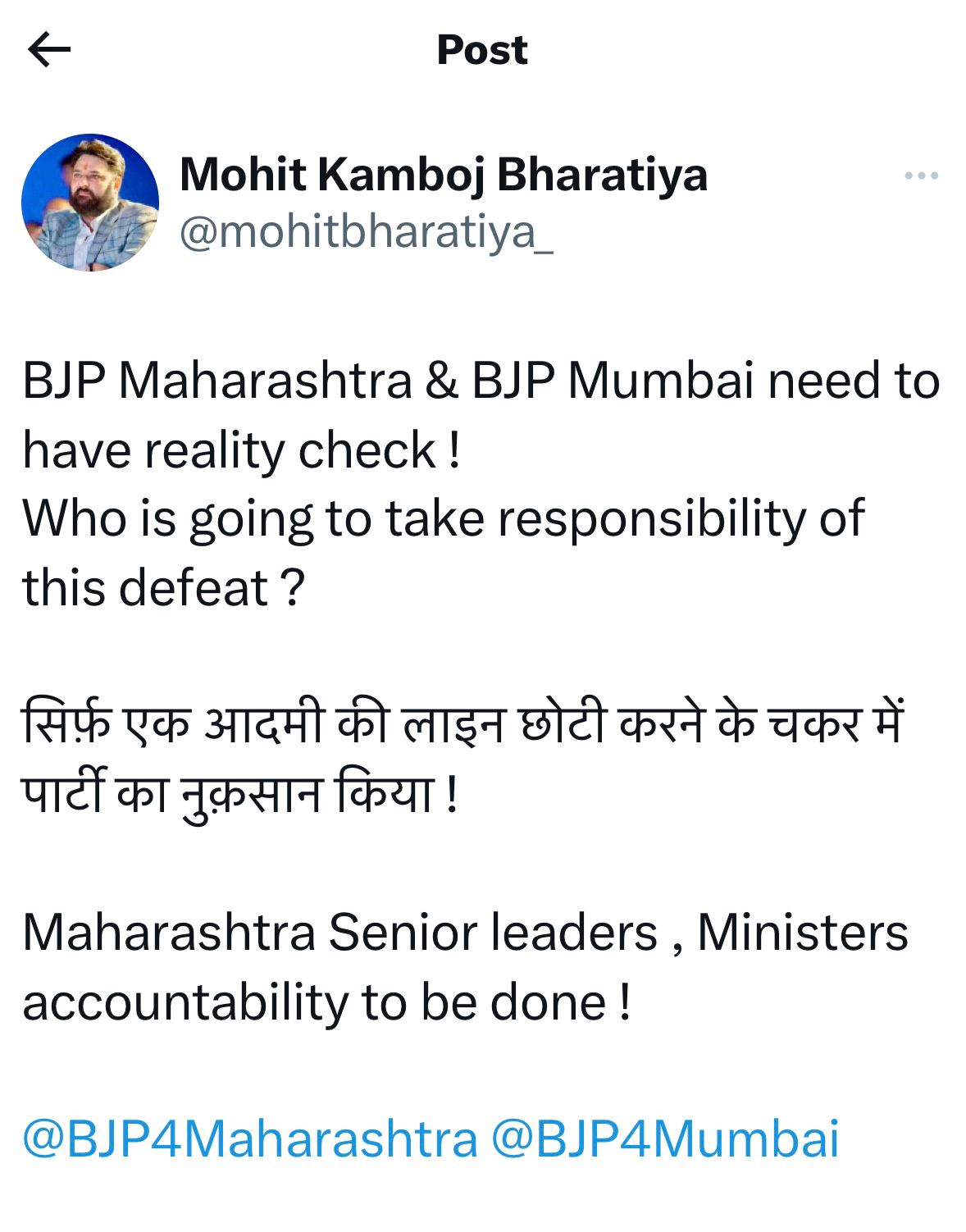 दरम्यान देवेंद्र फडणवीस यांनी राजीनामा द्यायची तयारी केल्यानंतर भाजपमधला वाद चव्हाट्यावर आला आहे. भाजप नेते मोहित कंबोज यांनी महाराष्ट्र आणि मुंबईमधल्या भाजप नेत्यांवरच निशाणा साधला आहे. एका माणसाची लाईन छोटी करण्याच्या नादात सगळ्या पक्षाचं नुकसान झालं आहे. आता याची जबाबदारी कोण घेणार? महाराष्ट्रातील सर्व वरिष्ठ नेते आणि मंत्र्यांनी ही जबाबदारी घ्यायला हवी, अशी पोस्ट मोहित कंबोज यांनी केली आहे.