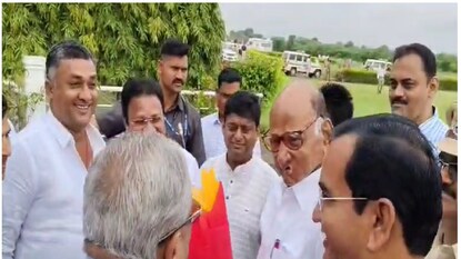 धुळे : राष्ट्रवादीचे अध्यक्ष, ज्येष्ठ नेते शरद पवार आज (रविवारी) धुळे दौऱ्यावर आहेत. शिरपूर विमानतळावर त्यांच्या स्वागताला महाविकास आघाडीच्या कार्यकर्त्यांनी गर्दी केली होती. यावेळी शिरपूर नगरीचे भाजपचे आमदार अमरीश पटेल यांनीही पवारांचे स्वागत केले. स्वागतावेळी उभय नेत्यांमध्ये मिश्किल संवाद झाला पण आजच्या सूड भावनेने पेटलेल्या राजकारणात दोघांमधला संवाद विशेषार्थाने महत्त्वाचा ठरला.
