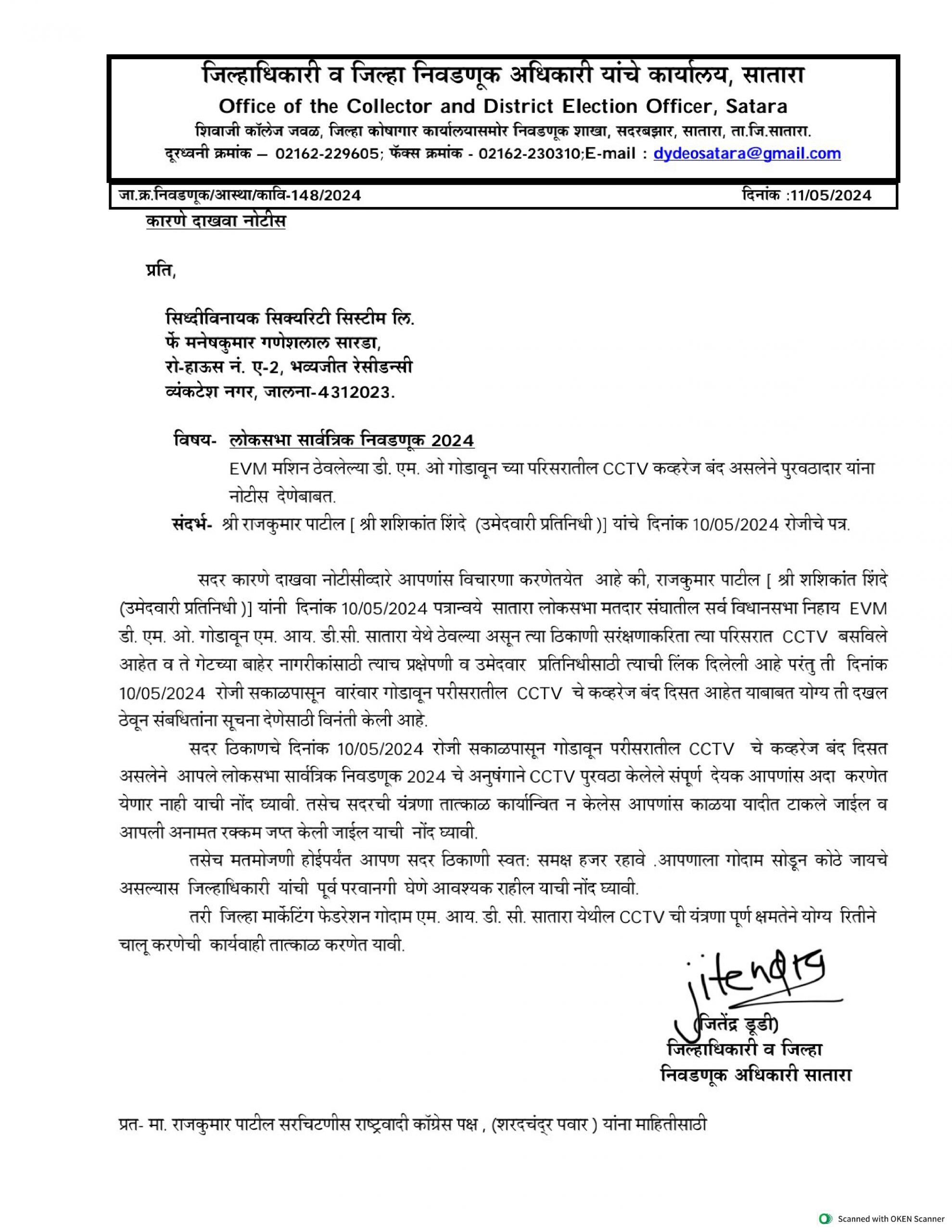 साताऱ्याची ईव्हीएम मशिन ठेवलेल्या गोदमाच्या परिसरातील सीसीटीव्ही यंत्रणा कोलमडली आहे. याबाबत राष्ट्रवादी काँग्रेस शरदचंद्र पवार पक्षाचे साताऱ्याचे जिल्हा सरचिटणीस राजकुमार पाटील यांनी जिल्हाधिकाऱ्यांकडे तक्रार केली आहे. या तक्रारीनंतर जिल्हाधिकारी जितेंद्र डूडी यांनी सिद्धीविनायक सिक्युरिटी सिस्टीम लिमिटेडचे ठेकेदार मनेश कुमार गणेश लाल सारडा यांना कारणे दाखवा नोटीस बजावली आहे.