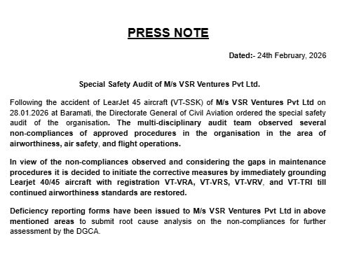 बारामती इथं 28 जानेवारी रोजी झालेल्या मेसर्स व्हीएसआर व्हेंचर्स प्रायव्हेट लिमिटेडच्या लिअरजेट 45 विमानाच्या (व्हीटी-एसएसके) अपघातानंतर, नागरी विमान वाहतूक महासंचालनालयाने संस्थेचे विशेष सुरक्षा ऑडिट करण्याचे आदेश दिले. बहु-ऑडिट टीमने संस्थेमध्ये हवाई योग्यता, हवाई सुरक्षा आणि उड्डाण ऑपरेशन्सच्या क्षेत्रात अनेक त्रुटी आढळून आल्या आहेत.