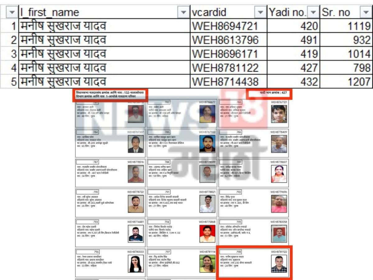 नालासोपारा विधानसभा मतदारसंघात एकाच व्यक्तीचे पाच वेगवेगळ्या मतदार यादीमध्ये वेगवेगळ्या वोटर आयडी क्रमांक वेगवेगळे सिरीयल एकाच व्यक्तीचे आल्यामुळे मतदारयादीमधील घोळ पुन्हा एकदा समोर आला आहे. नुकत्याच नालासोपारातील सुषमा गुप्ता प्रकरणात ज्या ठिकाणचा पत्ता दिला होता. त्या ठिकाणी ती राहतच नव्हती, मात्र, या ठिकाणी ज्या ठिकाणी पत्त्यामध्ये H / २३० विणा सरस्वती नालासोपारा, पूर्व येथे तो राहत होता. मात्र इतर चार ठिकाणी तो कधीच राहिला नव्हता. निवडणूक आयोगाचा कारभार पाहा, या मनीष सुखराज यादव वय २५ याचे फोटो सहित ५ याद्या ज्यामध्ये पत्ता वेगळा असला तरी एकाच रूमचा नंबर पाचही पत्त्यावर आहे.
