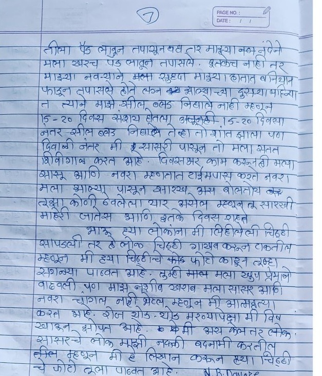 सासरच्या जाचाला कंटाळून तिने अखेर आयुष्य संपवण्याचा निर्णय घेतला. आधी गौरी आणि आता नाशिकची ही नेहा. या घटनेमुळे नाशिकमध्ये खळबळ उडाली आहे. पोलिसांनी सात पानांची ही चिठ्ठी ताब्यात घेतली असून गुन्हा दाखल केला आहे. पोलिसांकडून कुटुंबियांची चौकशी सुरू आहे.