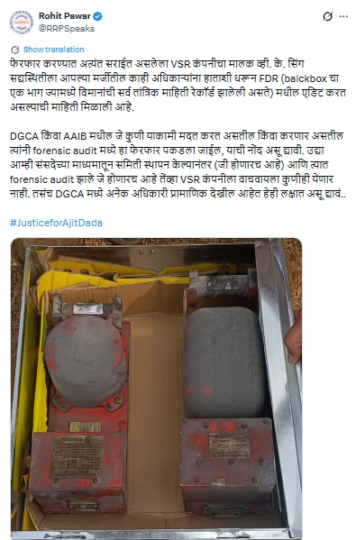 एक्स अकाऊंटवर केलेल्या पोस्टमध्ये रोहित पवार म्हणाले, "फेरफार करण्यात अत्यंत सराईत असलेला VSR कंपनीचा मालक व्ही. के. सिंग सद्यस्थितीला आपल्या मर्जीतील काही अधिकाऱ्यांना हाताशी धरून FDR (balckbox चा एक भाग ज्यामध्ये विमानांची सर्व तांत्रिक माहिती रेकॉर्ड झालेली असते) मधील एडिट करत असल्याची माहिती मिळाली आहे."