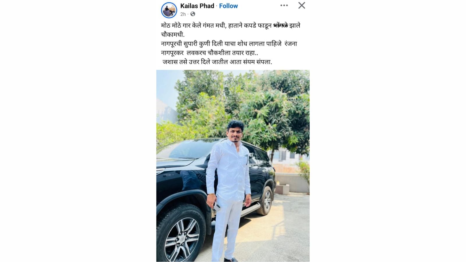 कैलास फड याने आपल्या फेसबूक अकाऊंटवर एक फोटो शेअर केला आहे. तो एका काळ्या रंगाच्या कारसमोर उभा राहिल्याचं दिसत आहेत. त्याच्या हातात मोबाईल आहे. या फोटोच्या कॅप्शनमध्ये त्याने रंजना नागपूरकर यांना इशारा दिला आहे. कॅप्शनमध्ये कैलास फड म्हणाला की, "मोठ मोठे गार केले गंमतमधी, हाताने कपडे फाडून भों*** झाले चौकामधी. नागपूरची सुपारी कुणी दिली याचा शोध लागला पाहिजे. रंजना नागपूरकर लवकरच चौकशीला तयार राहा... जशास तसे उत्तर दिले जातील, आता संयम संपला."