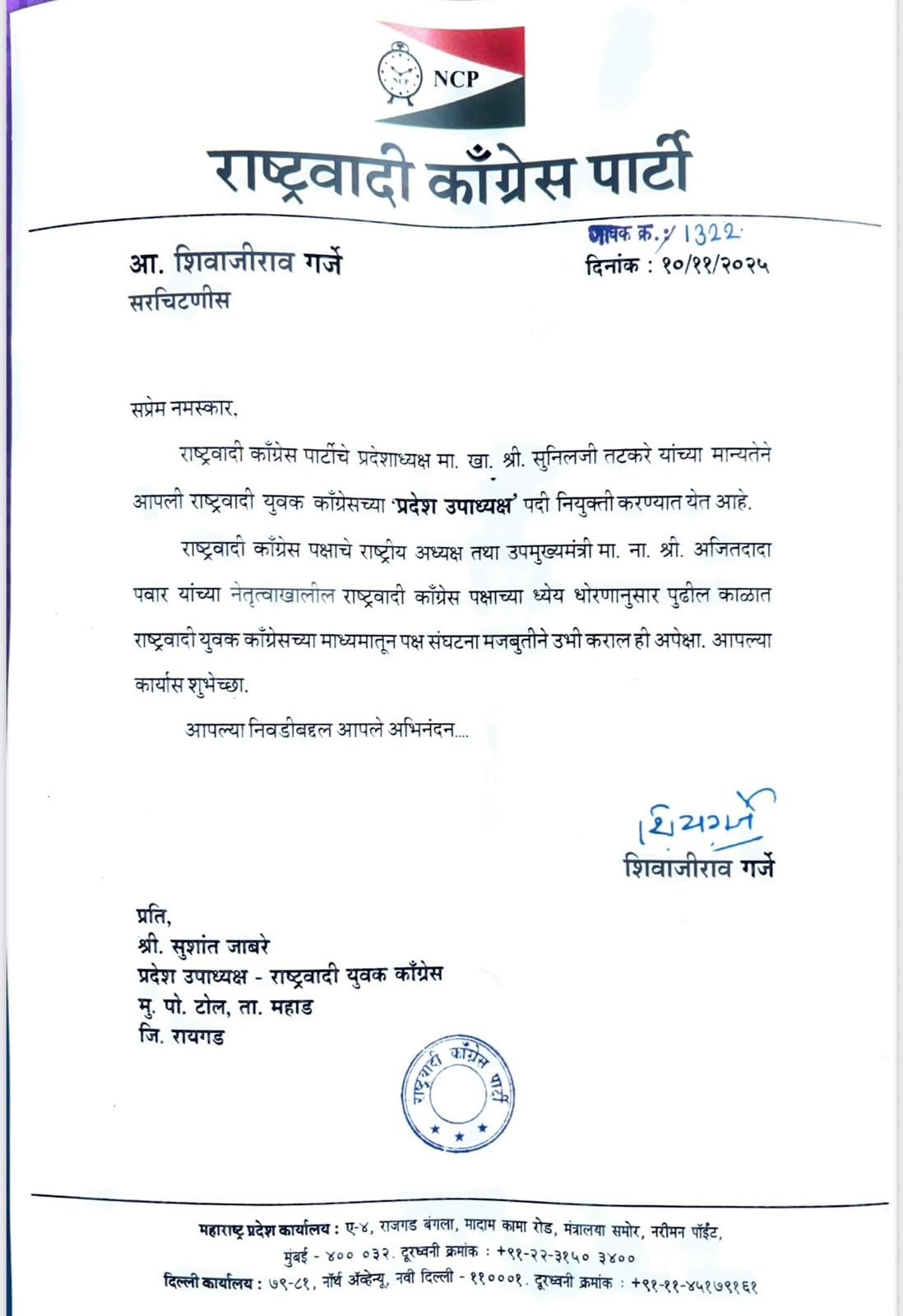 महाड तालुक्याच्या राजकारणात मोठी उलथापालथ झाली आहे. तालुक्यातील प्रभावशाली युवा चेहरा आणि कुणबी समाजाचे उदयोन्मुख नेते सुशांत गणेश जाबरे यांची राष्ट्रवादी युवक काँग्रेसच्या (अजित पवार गट) राज्य उपाध्यक्षपदी नियुक्ती करण्यात आली आहे. विशेष म्हणजे, पक्षप्रवेश केल्यानंतर अवघ्या काही आठवड्यांतच जाबरे यांना इतकी मोठी जबाबदारी मिळाल्याने, याकडे राष्ट्रवादी काँग्रेसच्या (अजित पवार गट) धोरणात्मक हालचालीचा महत्त्वपूर्ण भाग म्हणून पाहिले जात आहे.