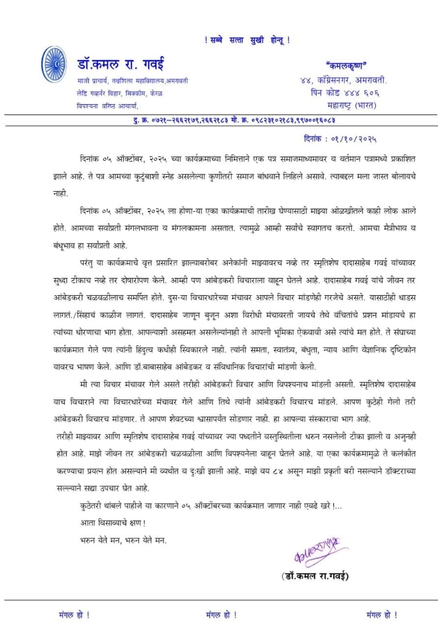 अमरावती: राष्ट्रीय स्वयंसेवक संघाचा अमरावतीमध्ये ५ ऑक्टोबरला विजयादशमी सोहळा आयोजित करण्यात आला आहे. या कार्यक्रमाला सरन्यायाधीश भूषण गवई यांच्या मातोश्री कमलताई यांना आमंत्रित करण्यात आल्याचं पत्र सोशल मीडियावर व्हायरल झालं आहे. अखेरीस या वादावर खुद्द कमलताई गवई यांनी भूमिका मांडली आहे. आपण, या संघाच्या कार्यक्रमाला जाणार नाही, असं कमलताई गवई यांनी स्पष्ट केलं आहे.