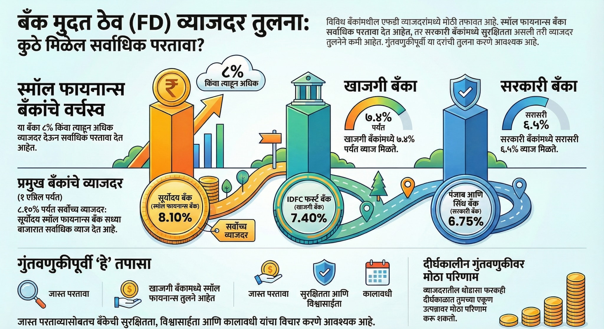 एफडीवरील व्याजदर बँकेनुसार मोठ्या प्रमाणात बदलतात. स्मॉल फायनान्स बँका जास्त व्याज देत असताना, प्रायव्हेट आणि सार्वजनिक क्षेत्रातील बँका तुलनेने कमी परतावा देत आहेत. व्याजदरातील थोडासा फरकही विशेषतः दीर्घकालीन गुंतवणुकीत एकूण उत्पन्नावर मोठा परिणाम करू शकतो.