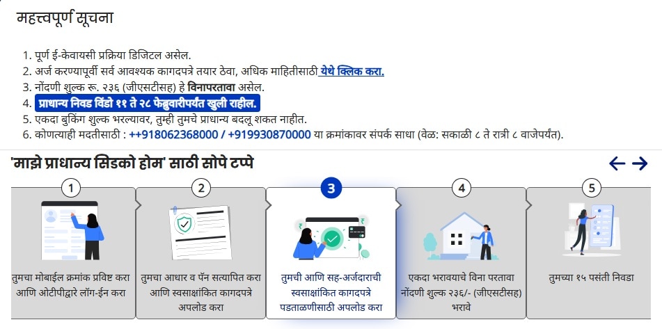 कागदपत्रे व्हेरिफाय झाल्यानंतर तुम्हाला सध्या सुरू असलेल्यालाईव्ह स्कीम दिसतील. तुम्हाला ज्या भागात घर हवं आहे (उदा. तळोजा, द्रोणागिरी किंवा खारघर) त्या भागातील घरांची निवड करा. तुमची जात किंवा आरक्षण प्रवर्ग असल्यास त्याचा पर्याय नीट निवडा. तुम्हाला तिथे तीन प्रेफरन्स निवडायचे आहेत. पहिल्या प्रेफरन्समध्ये पाच प्रकल्प निवडता येणार आहेत. तुम्ही एकाच प्रोजेक्टमधील वेगवेगळ्या इमारती देखील निवडू शकता.