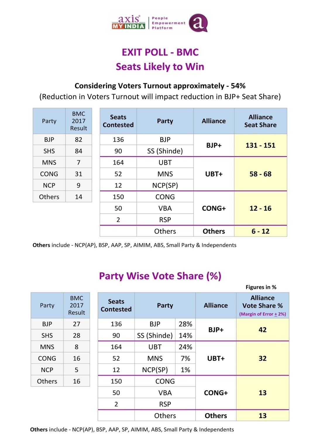 तर, नेटवर्क १८ च्या सीएनएन न्यूज मेगा पोलने एक्झिटचा अंदाज समोर आला आहे. या एक्झिट पोलमध्ये मुंबईत उद्धव ठाकरे आणि राज ठाकरे यांच्या शिवशक्तीला ३५ टक्के मतदान मिळेल असा अंदाज वर्तवला आहे. या मतदानाच्या टक्केवारीनुसार, ठाकरे बंधूंना ५९ जागा मिळतील असा अंदाज वर्तवला आहे.