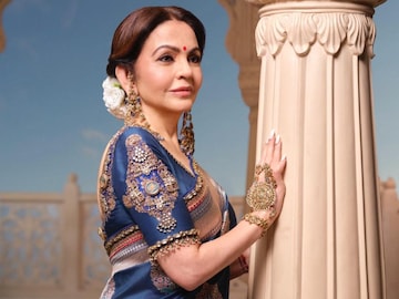 नीता अंबानी यांनी इरोसमधील स्वदेशच्या फ्लॅगशिप स्टोअरमध्ये भारतातील कलाकार आणि कारागिरांच्या सन्मानार्थ एक खास उत्सव आयोजित केला होता. या प्रसंगी त्यांनी स्वदेशमधील मोरपंखी निळ्या रंगाची बनारसी साडी परिधान केली होती. या साडीवर अत्यंत सूक्ष्म आणि नाजूक मीना नक्षीकामाची (Meena motifs) कलाकुसर दिसत होती, तसेच पारंपरिक कढुआ विणकाम तंत्र (Kadhua weaving technique) वापरून ती साडी अधिक समृद्ध आणि उठावदार करण्यात आली होती.