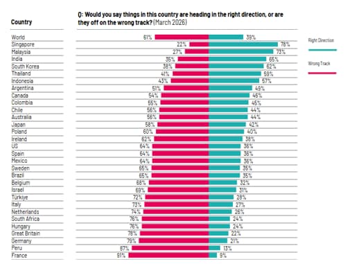 या सर्वेक्षणात जगातील 29 प्रमुख बाजारपेठांचा अभ्यास करण्यात आला. त्याचे निष्कर्ष धक्कादायक आहेत. जगातील 25 देशांमधील बहुसंख्य नागरिकांना वाटते की त्यांचे देश 'चुकीच्या' दिशेने जात आहेत. मात्र या जागतिक निराशेच्या विरोधात भारत, सिंगापूर, मलेशिया, दक्षिण कोरिया आणि थायलंड या पाच देशांनी आपली सकारात्मकता कायम ठेवली आहे.