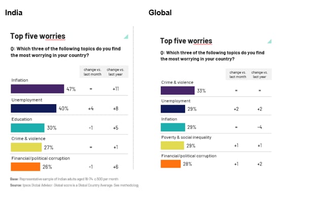 जागतिक स्तरावर गुन्हेगारी, बेरोजगारी, महागाई, गरिबी आणि सामाजिक असमानता हे पाच मुद्दे सर्वात जास्त चर्चेत आहेत. भारताच्या बाबतीतही हेच मुद्दे महत्त्वाचे असले तरी भारताचा प्राधान्यक्रम थोडा वेगळा आहे. भारताचे नागरिक जागतिक अस्थिरतेमध्येही देशाच्या आर्थिक प्रतिकारक्षमतेवर (Resilience) अधिक विश्वास ठेवून आहेत.
