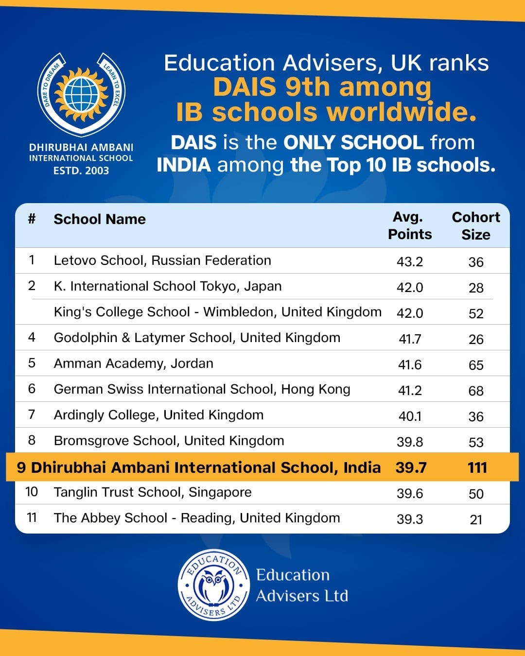 धीरूभाई अंबानी आंतरराष्ट्रीय शाळेला Education Advisers UK च्या IBDP जागतिक क्रमवारीत ९ वा क्रमांक मिळाला असून, टॉप-१० मध्ये स्थान मिळवणारी ही एकमेव भारतीय शाळा आहे.